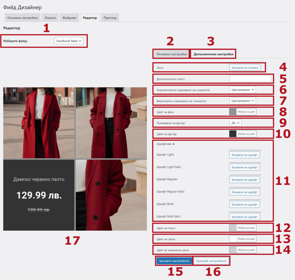 Елементите номерирани в картинката отговарят за следните функционалности за „Основните настройки„: