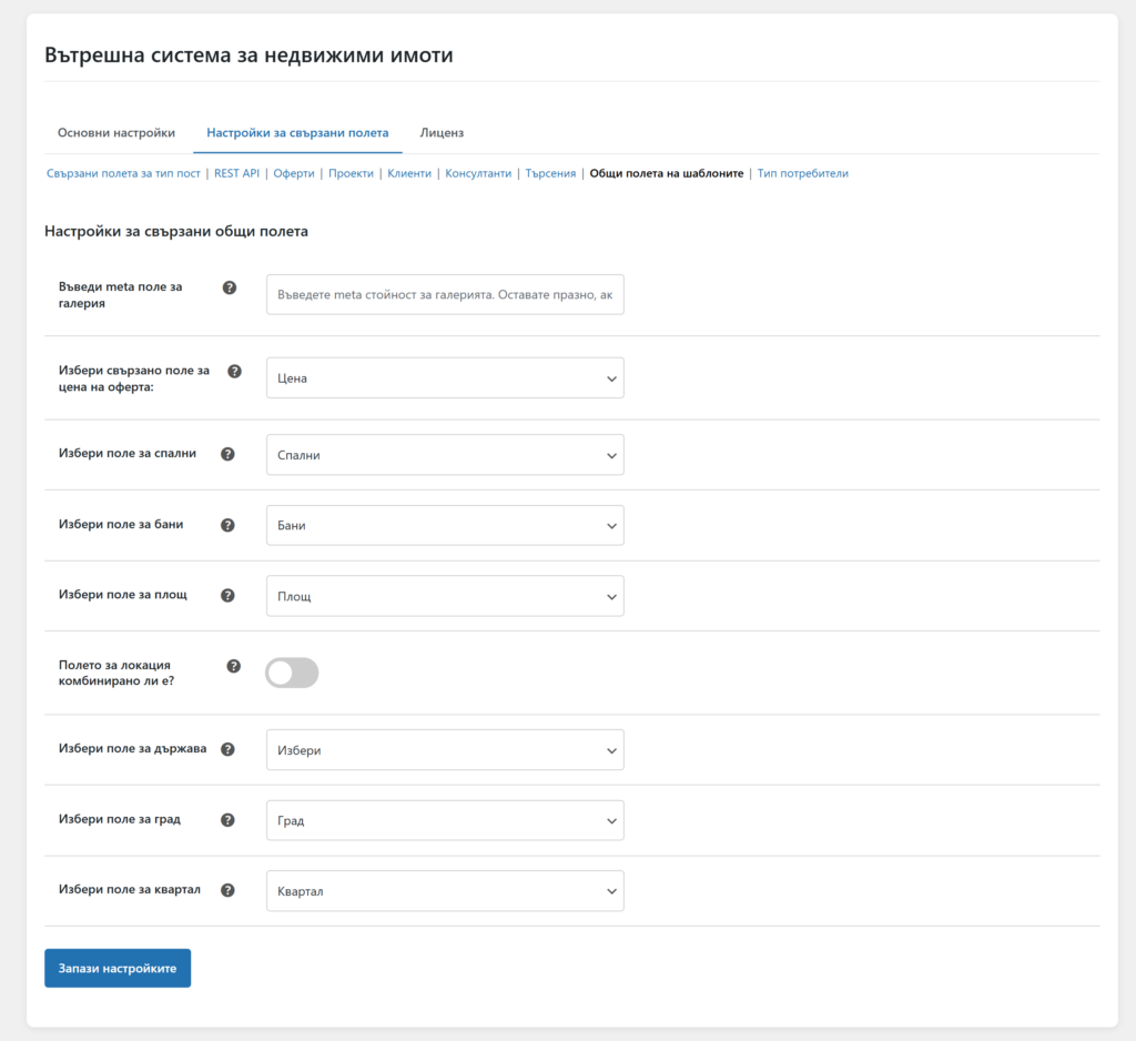 В секцията „Настройки за свързани общи полета“ можете да настроите полета, които да бъдат използвани в шаблоните за общия изглед на офертите.