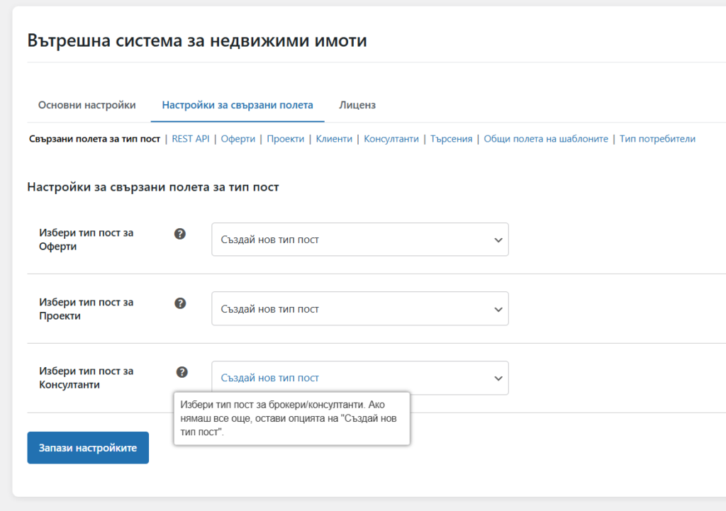 В „Настройки за свързани полета за тип пост“ можете да зададете кой тип пост отговаря на съответната опция, ако имате такива създаде от тема, плъгин или къстъм код.