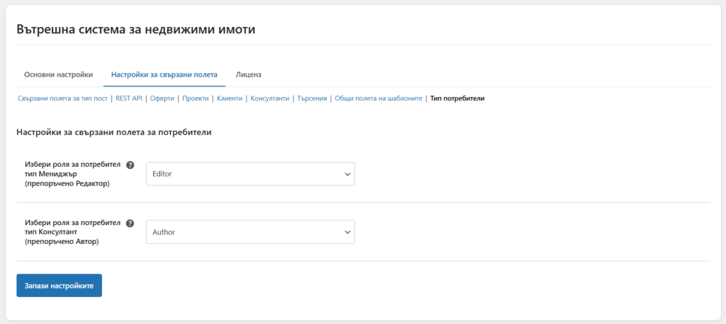 В секцията „Тип потребители“ имате възможността да зададете какви права да имат потребителите, които ще имат роля на „Мениджър“ и на „Консултант“.