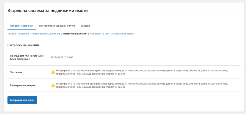 В настройки на клиенти можете да генерирате „Таен ключ“ (SECRET_KEY) и „Еднократна проверка“ (Nonce), които служат за криптирането на личните данни на клиентите.