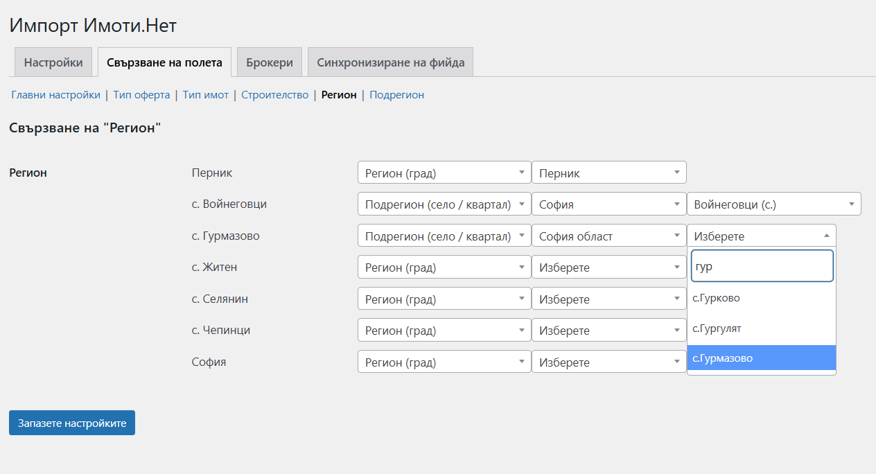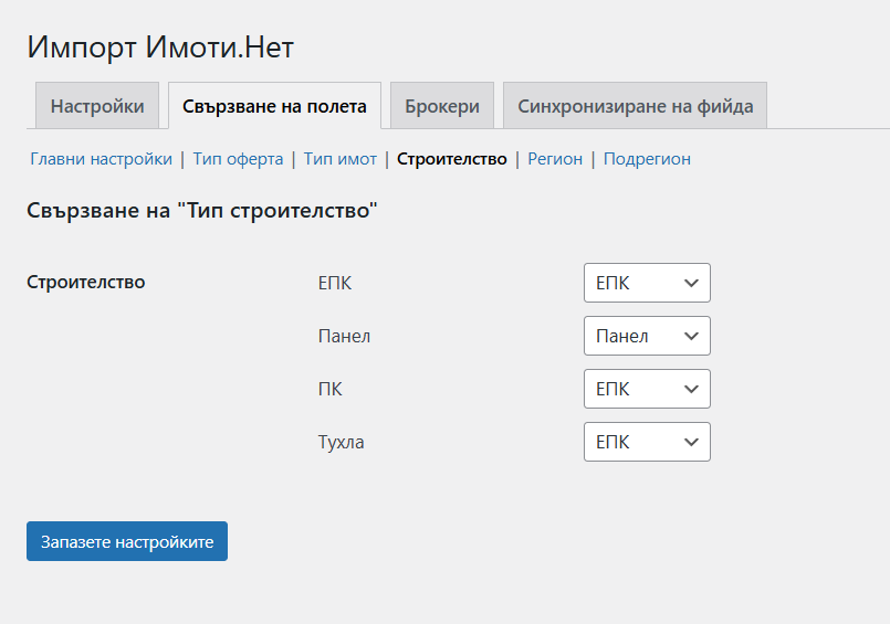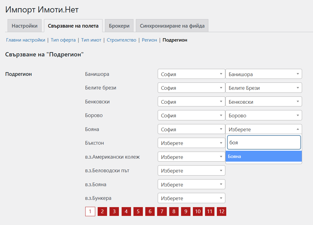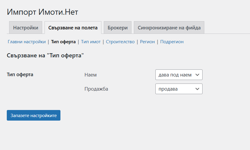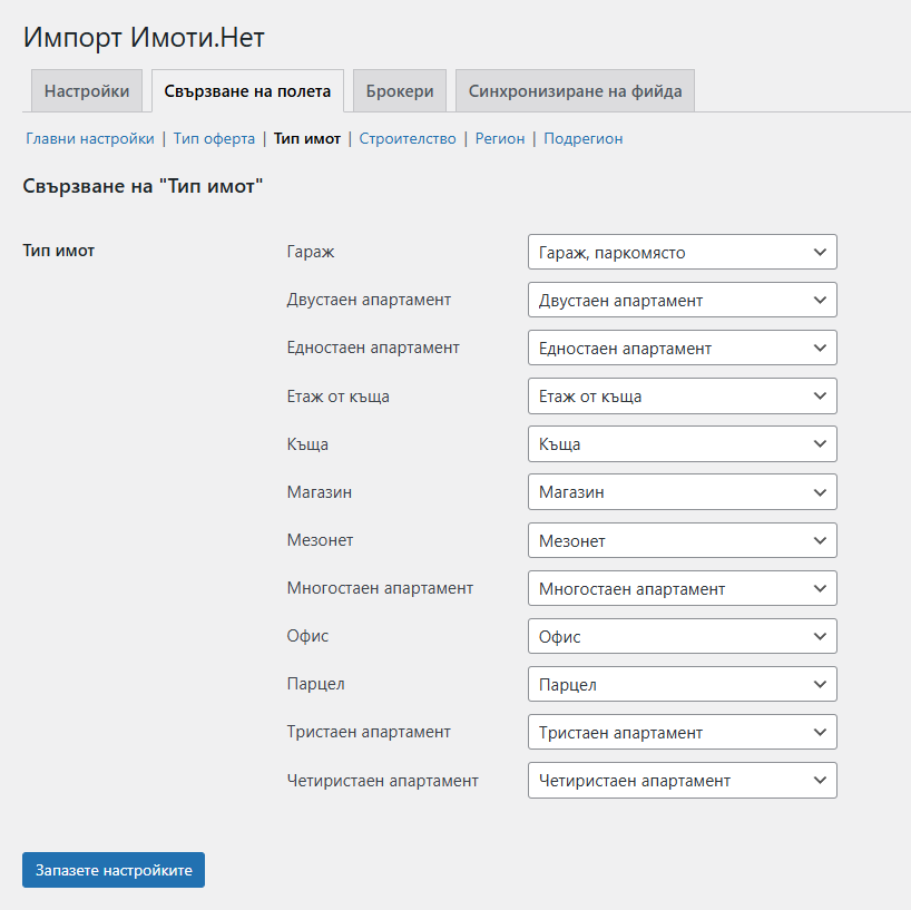 - Влезте в подразделите, за да свържете данните за тип имот, тип оферта и др. с номенклатурите на съответния портал.