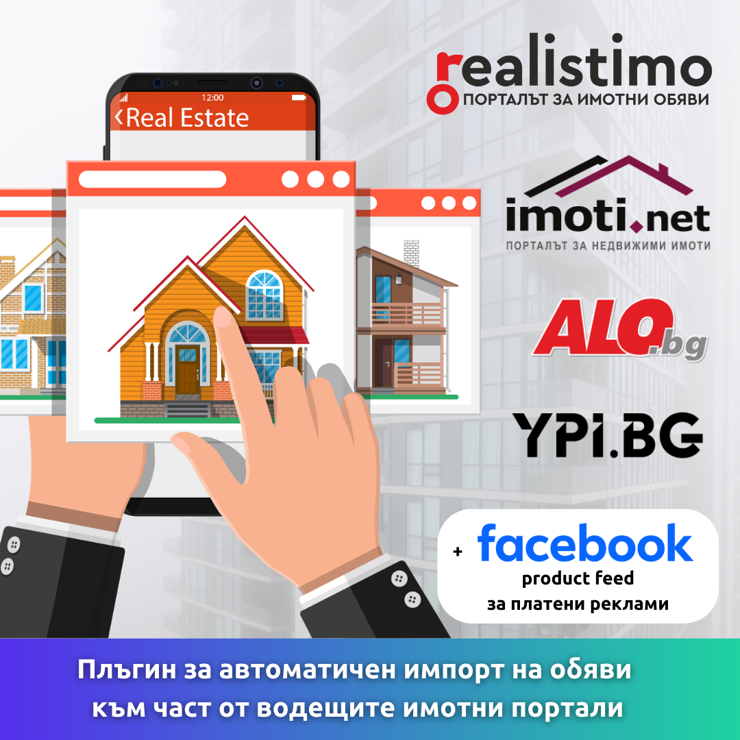 Автоматичен импорт на Вашите обяви към имотните портали imoti.net, realistimo.com, alo.bg + facebook product feed (за реклами)