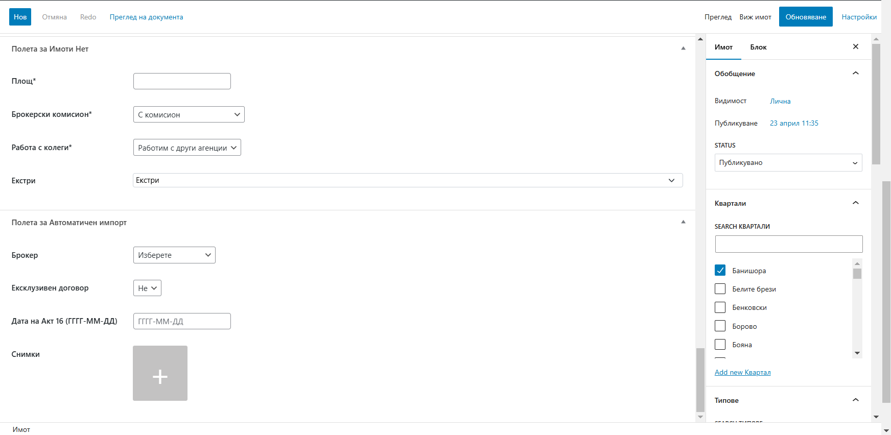 - Лесно свързване на полета и таксономии: Всяко поле, необходимо за качване на обява в имотните портали, се свързва с полетата и таксономиите на Вашия сайт, като осигурява безпроблемен и коректен трансфер на информация.