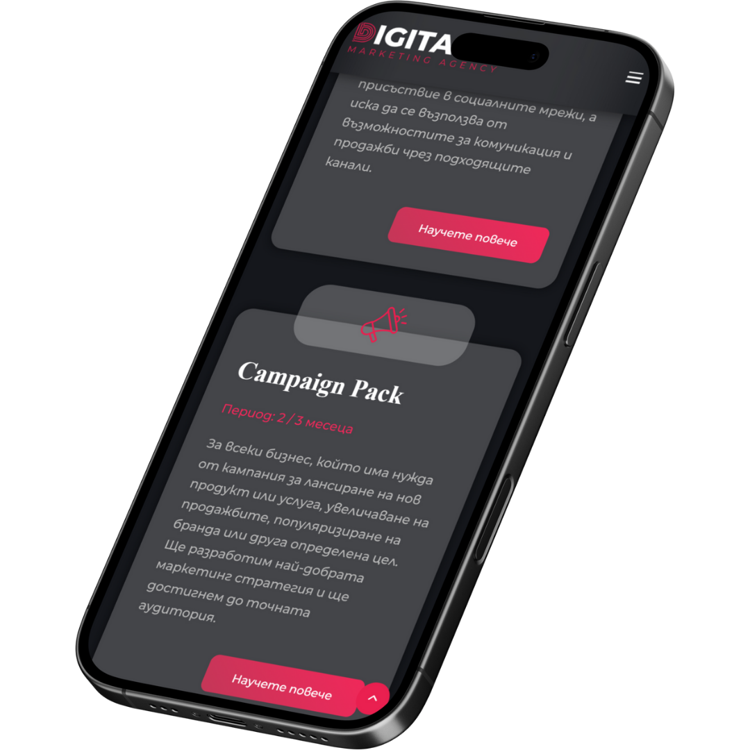 Ключов елемент от съдържанието на уебсайта, създадена с цел да информира посетителите за различните пакети за дигитален маркетинг, които агенцията предлага. Страницата е структурирана така, че да улесни потребителя при избора на най-подходящото решение според спецификите и целите на неговия бизнес.